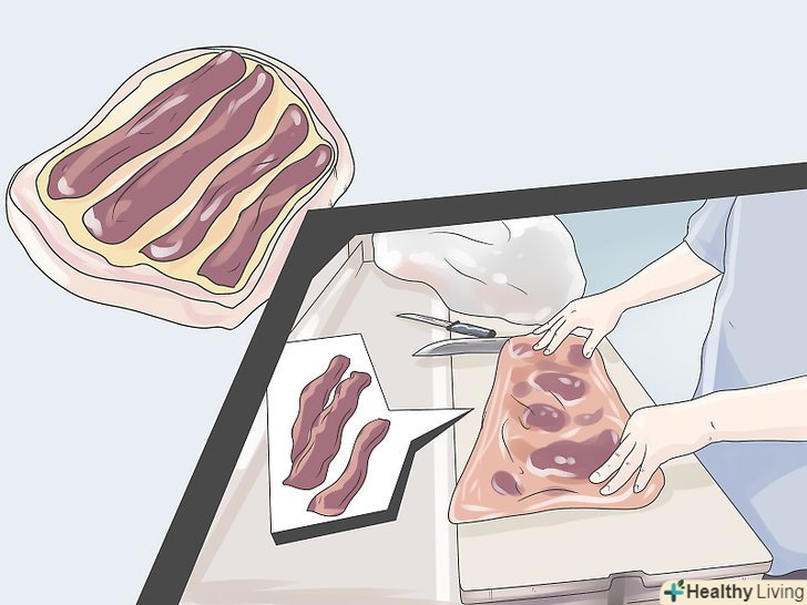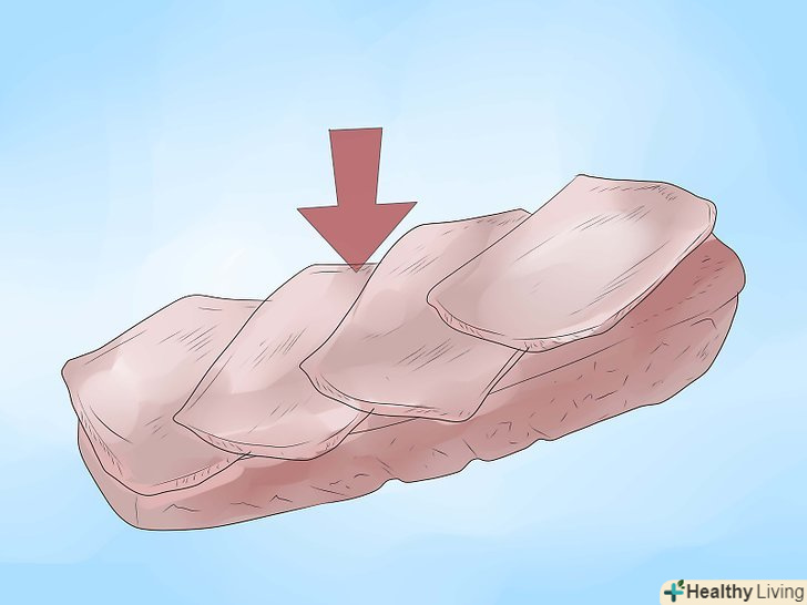 Розкладіть м'ясо на" верхівку " хліба.як тільки ви розкриєте хліб, зробіть так, щоб він залишився розкритим. Розкладіть свої скибочки м'яса на половинку хліба, яка є верхньою частиною. Кількість м'яса, яке ви покладете, залежить від вас (так як ви робите це вдома, то немає ніяких обмежень, з приводу кількості використовуваного м'яса!). Розкладіть м'ясо так, щоб воно покрило всю верхню частину.