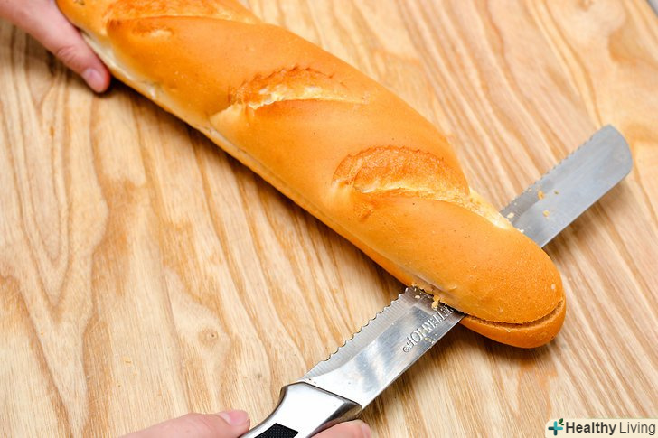 Розтеліть великий шматок вощеного паперу.це дозволить зробити підкладку під всю довжину хліба і не дозволить начинці впасти на стіл (так ви зможете просто покласти їх назад в сендвіч). Розкладіть свій хліб на папері і розріжте його навпіл уздовж так, щоб він відкрився, як рот (щоб проковтнути всі ті смачні інгредієнти).