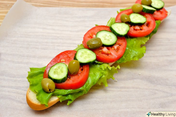 Розкладіть овочі на нижній половині хліба. Переконайтеся, що вони помістяться. І знову, оскільки ви робите свій сендвіч вдома, немає певної послідовності, в якій ви повинні розмістити овочі на своєму сендвічі (плюс, всі хочуть різні начинки на їх саб). В цілому, ви можете розкласти так, спочатку салат, а потім великі овочі і закінчити оливками/солоними огірками/маленькими овочами, ніж захочете.