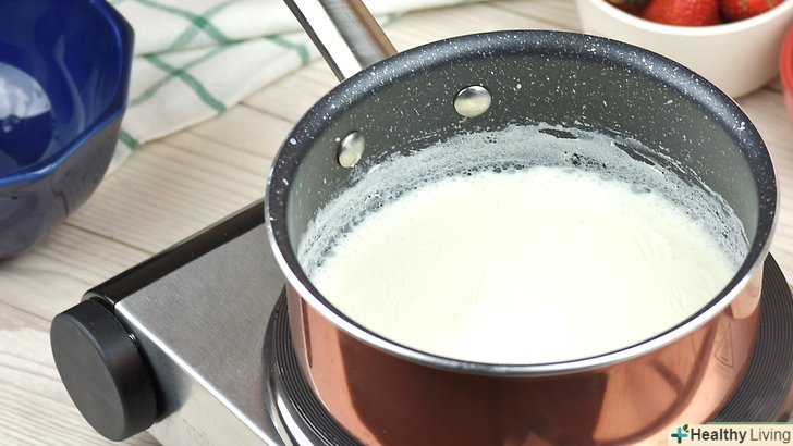 Доведіть суміш до кипіння і дайте покипіти на слабкому вогні.порошок агар-агару повинен покипіти близько 5 хвилин, пластівці і смужки — від 10 до 15 хвилин.[10] помішуйте суміш до тих пір, поки агар-агар повністю не розчиниться. Під час цього процесу агар-агар вбирає в себе рідину, яка змушує його перетворюватися в желе при охолодженні.[11]- Як можна краще розігрійте рідину. На відміну від желатину, агар-агар застигає при більш високій температурі. Він почне застигати, як тільки рідина досягне температури 45 °C. При додаванні інших інгредієнтів температура може знизитися, і агар-агар застигне швидше, ніж вам потрібно, тому розігрійте рідину так, щоб її температура не падала нижче 45 °C, коли ви знімете її з вогню.[12]