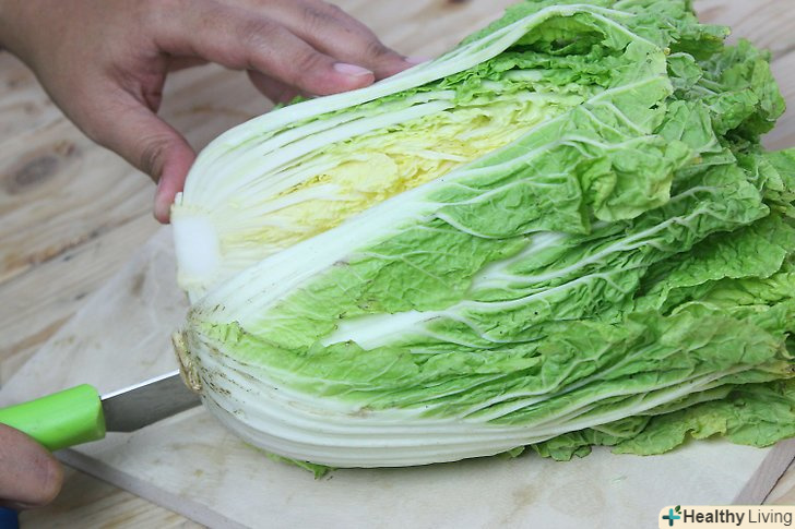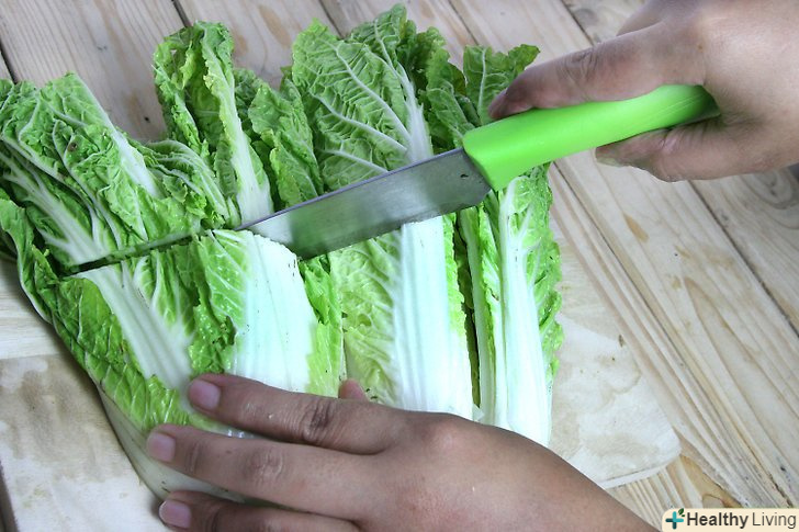 Розріжте качан навпіл уздовж.покладіть качан капусти на бік і розріжте його навпіл уздовж від вершини качана через середину.- Не потрібно видаляти частину серцевини, коли нарізаєте довгу капусту. Навпаки, для того щоб шматки вийшли у формі клинів, серцевину краще залишити. Вона з'єднує листя, а це означає, що шматки капусти не розваляться.