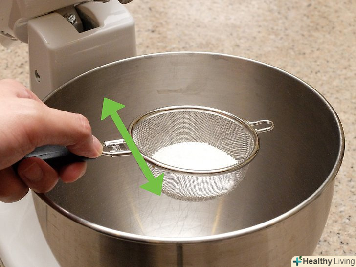Просіювання за допомогою решета або друшляка.якщо у вас немає сита, можна легко просіяти борошно через будь-який відповідний фільтр з дрібними осередками.- Просто насипте борошно в фільтр і постукуйте по його сторонах або використовуйте вилку, щоб просіяти борошно.