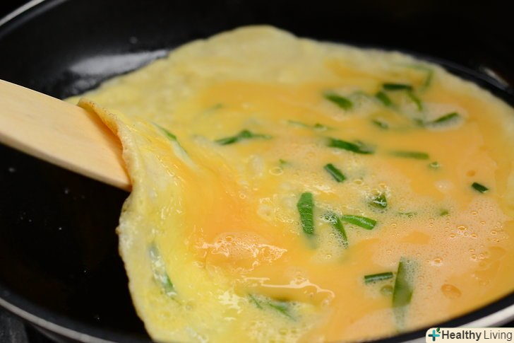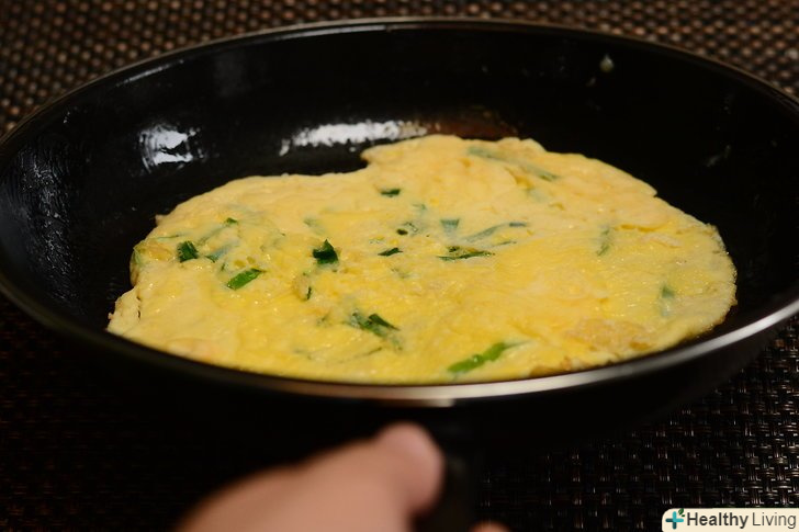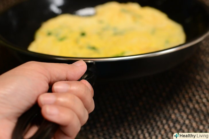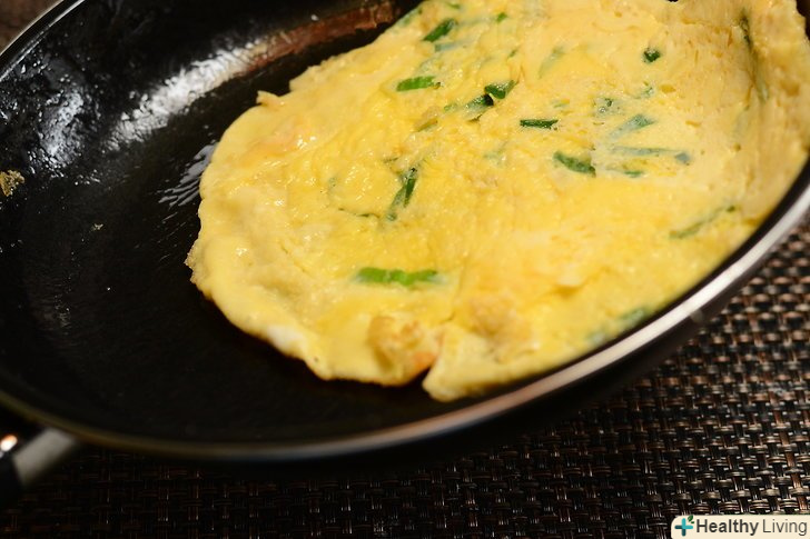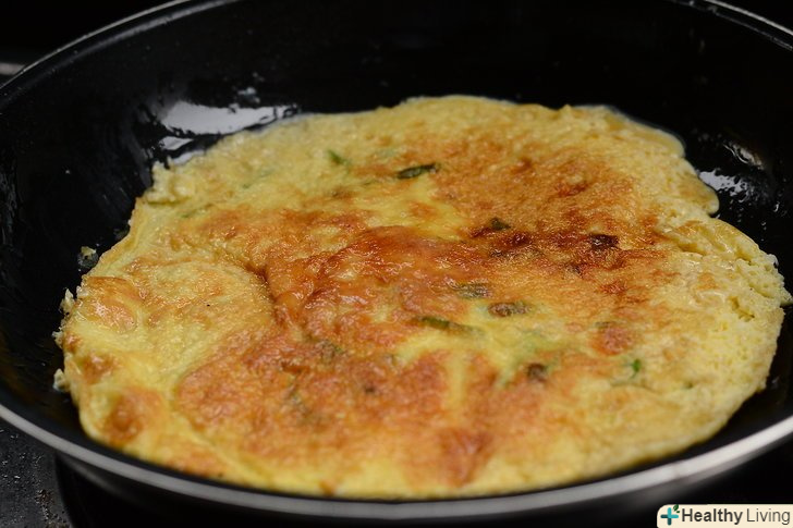 Різким рухом викиньте сковорідку вперед, трохи вгору, і ще трохи вище-це допоможе підняти омлет досить високо, щоб перевернути його в повітрі.