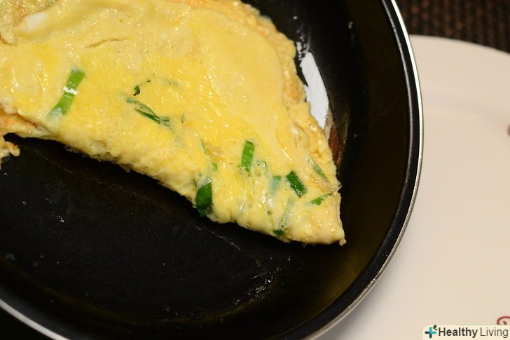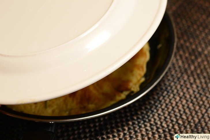 Для цього накрийте омлет тарілкою, дуже обережно переверніть сковороду разом з тарілкою, потім, міцно утримуючи і те, і інше, поверніть омлет з тарілки на сковороду.з метою безпеки не варто довіряти це дітям. Даний спосіб дуже часто застосовується при перевертанні великих омлетів, але головне в ньому — переконатися, що тарілка не зісковзує, інакше можна обпектися або зіпсувати омлет. Ось чому вам потрібна тарілка з широким краєм для надійного захоплення.- Не варто застосовувати цей спосіб, коли на сковороді накопичилося багато рідкого жиру, ви можете обпектися (див.
