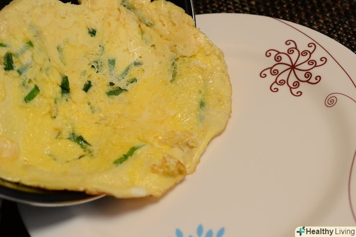 Виберіть тарілку або блюдо діаметром на п'ять сантиметрів більше, ніж ваш готовий омлет і посуньте приготований омлет на тарілку засмаженою стороною вниз.