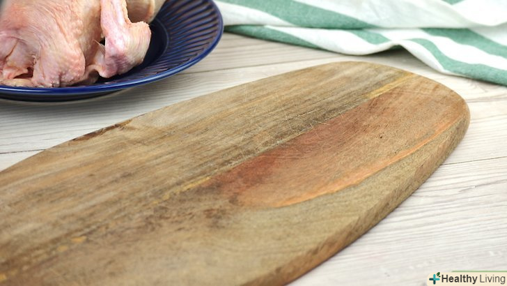 Приготуйте поверхню, де ви будете обробляти курку.покладіть курку на тверду обробну дошку, на якій ви обробляєте м'ясо. Після оброблення курки ретельно помийте всі поверхні, яких стосувалася сира курка, тільки після цього кладіть на неї інші продукти.