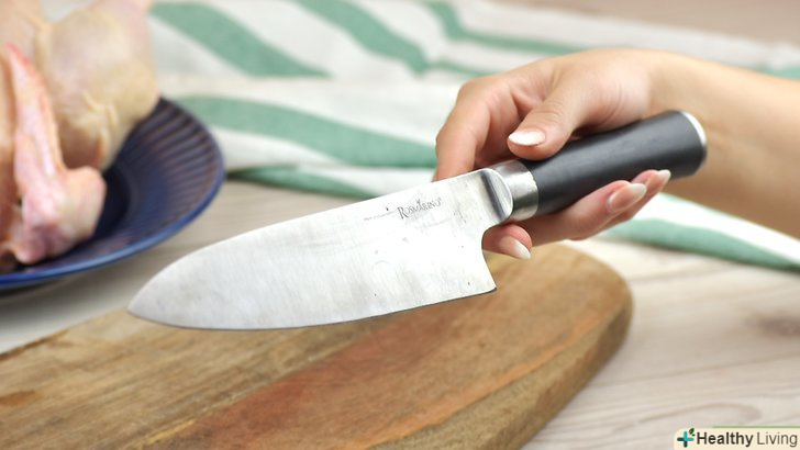 Використовуйте гострий і міцний ніж.ви будете різати кістки, тому ніж повинен бути досить міцним, інакше ви не впораєтеся з поставленим завданням. Хороший ніж для оброблення м'яса або кухонних топірець цілком підійде. Заточіть Кухонні ножі перед тим, як приступити до оброблення курки.