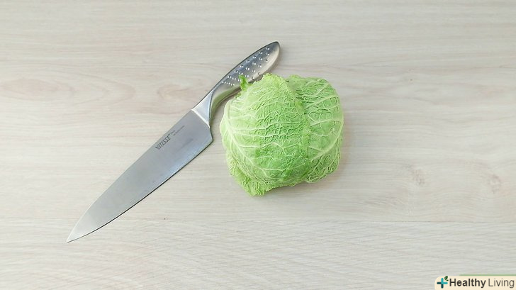 Візьміть довгий ніж з нержавіючої сталі.ви впораєтеся набагато швидше, якщо довжина леза ножа буде більше діаметра капусти. Намагайтеся не використовувати ножі з вуглецевої сталі, так як це призводить до появи чорноти на торці зрізаної м'якоті.[1]- На стійкій обробній дошці розріжте капусту на чотири чверті.притисніть капусту до обробної дошки, утримуючи її при цьому пальцями. Зробіть розріз прямо посередині одним плавним рухом.