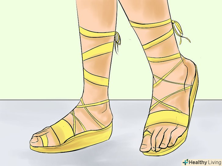 Підберіть підходящу для костюма взуття.якщо ви хочете бути схожою на грецьку богиню, то вам необхідна відповідна взуття. Не надягайте черевики або кросівки. Вам необхідно взутися в звичайні сандалі або сандалі на мотузочках. Ідеальним варіантом стануть золотисті або бежеві сандалі.[7]- Якщо ви хочете створити імітацію гладіаторських сандалій, візьміть стрічку і обмотайте нею ікри ніг від п'ят до колін.