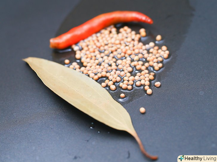 Налийте на сковороду масло і поставте на вогонь, всипте насіння гірчиці.як тільки насіння тріснуть, додайте 2 перцю чилі і листя каррі.