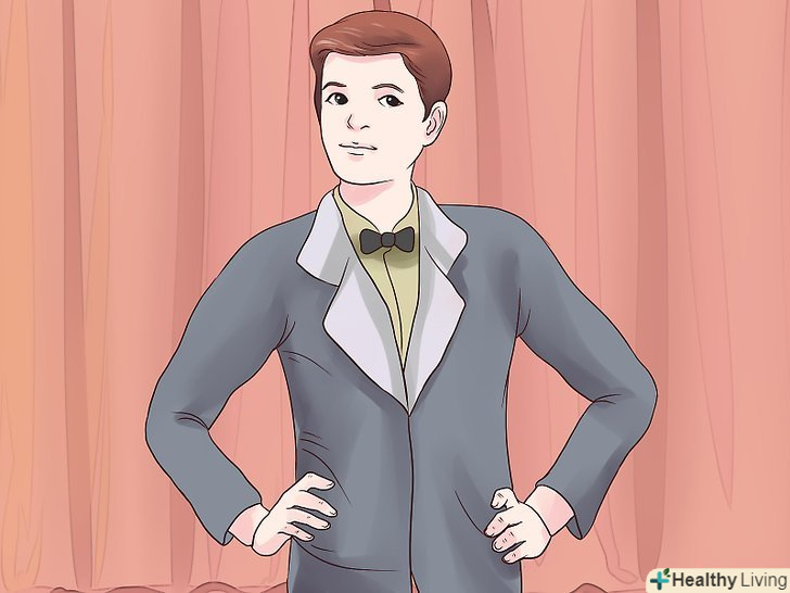 Одягніть яскравий костюм з блискітками.найяскравіший костюм у фільмі "Шоу жахів Роккі Хоррора" був у Коламбії. Подібно до неї, прикріпіть до свого костюма золотисті або різнокольорові блискітки і зробіть блискучий макіяж. Ефект збільшиться, якщо ви одягнете блискучу капелюх і сітчасті панчохи, а також використовуєте туш для брів[3].