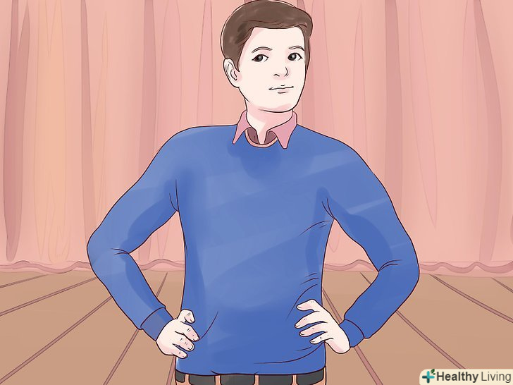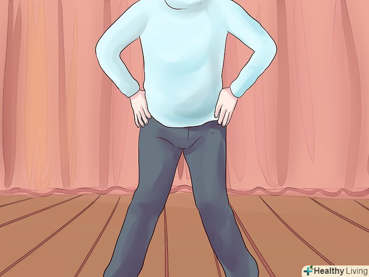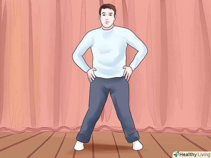 Зробіть крок вправо (чотири рази)!При цьому ліва ступня повинна стосуватися підлоги, і слід продовжувати дивитися перед собою. Зробіть крок правою ногою в сторону, потім підтягніть до неї ліву ногу, з'єднавши ступні. Як правило, цей рух повторюють чотири рази поспіль, перші три рази торкаючись підлоги лише пальцями ніг[1]. У четвертий, останній раз опустіть на підлогу ступні, розвівши ноги в сторони.- При бажанні, роблячи кроки, можна одночасно піднімати руки в сторони і знову опускати.