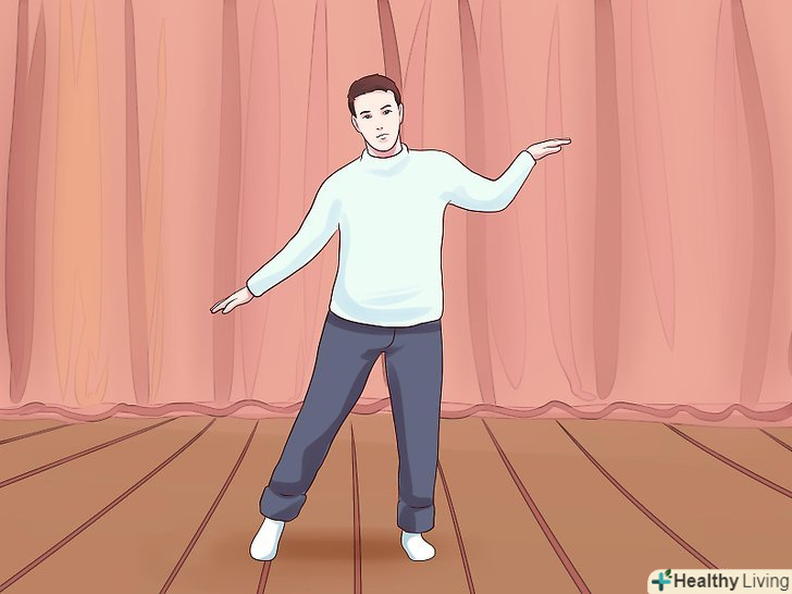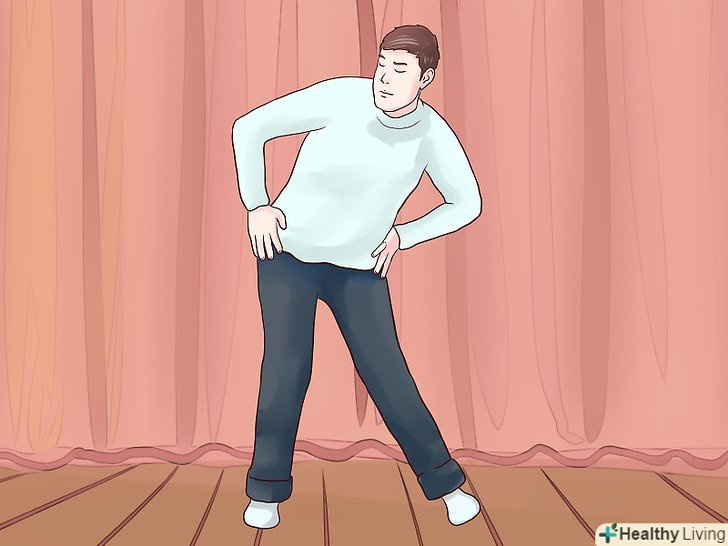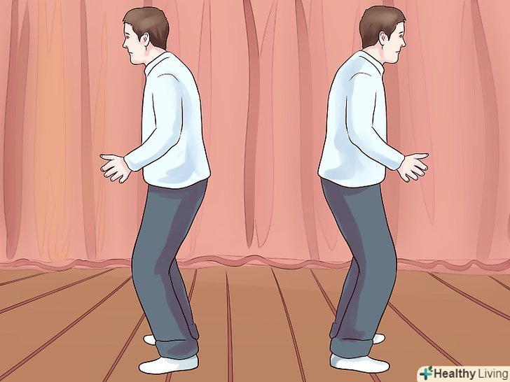 Стрибайте вліво!поставте ноги разом, притиснувши ступні один до одного або злегка розвівши шкарпетки в сторони. Відштовхнувшись обома ногами від підлоги, зробіть невеликий стрибок вліво. При цьому продовжуйте дивитися вперед.- Якщо ви хочете привнести в танець більше експресії, при стрибку можна хвилеподібно рухати руками, або погойдатися з боку в бік після приземлення.