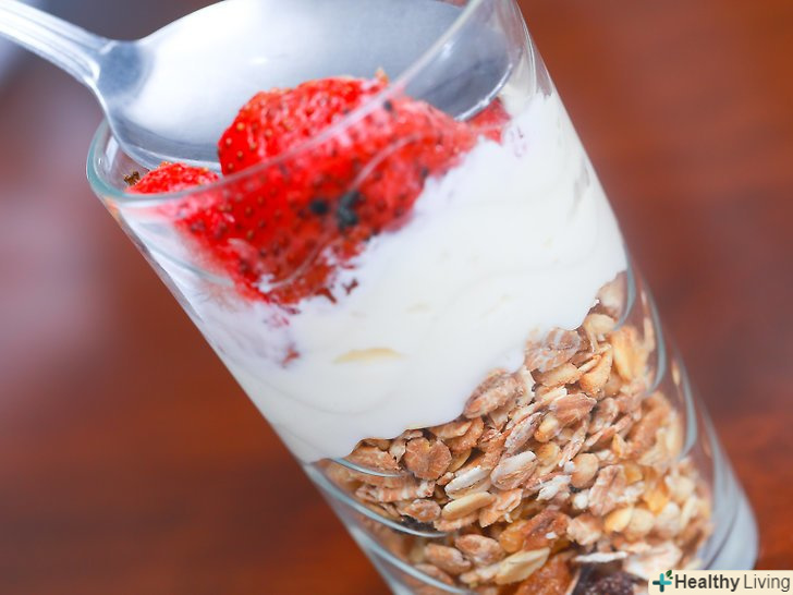Приготуйте парфе.якщо смузі Вам подобається не так сильно, як хрусткі сніданки, спробуйте приготувати заморожений десерт парфе з йогурту і фруктів.- Змішайте разом низькокалорійний йогурт з декількома корисними начинками. Візьміть подрібнені горіхи, вівсяні пластівці і свіжонарізані фрукти для більшої солодощі.[8]