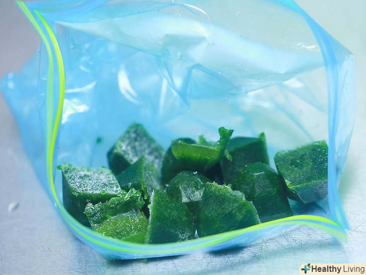 Перемістіть застигле пюре в пакети для заморозки.витягніть заморожені кубики шпинату з лотків і упакуйте їх в поліетиленові пакети для заморозки. Перш ніж запечатати пакети, видавіть з них залишки повітря.- Якщо виникнуть труднощі, коли ви будете витягувати кубики з лотків, дайте їм трохи відтанути при кімнатній температурі. Повторіть спробу, коли стінки і дно кубиків злегка розм'якнуть, але до того, як вони розтануть.