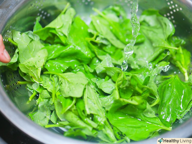 Замочіть шпинат у холодній воді.помістіть свіже листя шпинату у велику миску і залийте їх чистою, холодною водою.- Перемішайте і переберіть листя шпинату, поки вони будуть замочуватися. Переберіть шпинат, щоб прибрати пошкоджені листя, бур'яни, комах, камені, бруд та інше сміття.