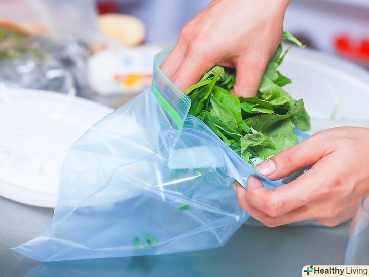 Запакуйте шпинат в пакети для заморозки.заповніть один або кілька поліетиленових пакетів для заморозки під зав'язку вимитим шпинатом. Вичавіть зайве повітря, а потім закрийте пакети.[1]- Не бійтеся упаковувати шпинат якомога щільніше. Чим щільніше ви упакуєте шпинат, тим менше повітря залишиться в пакеті.