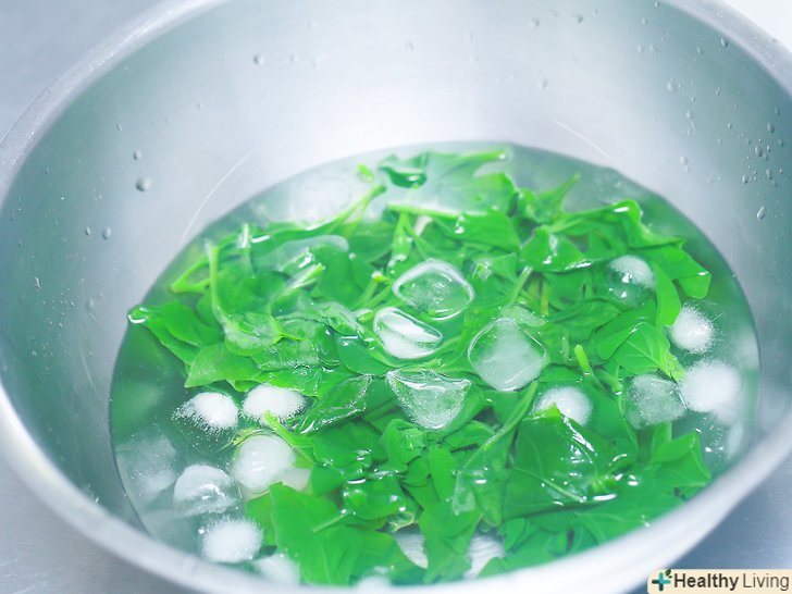 Перенесіть листя в охолоджену воду.витягніть шпинат з каструлі і помістіть його у велику миску з крижаною водою. Занурте шпинат в холодну воду на дві хвилини.- Швидка зміна температури повинна зупинити процес готування і втрату поживних речовин, але при цьому зберегти колір і аромат шпинату.