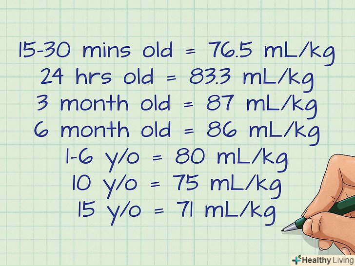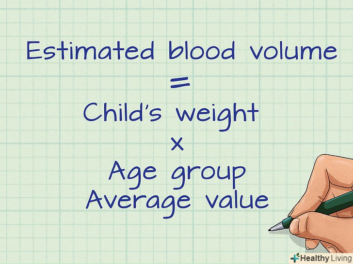Підрахунок об'єму крові.помножте вагу дитини на коефіцієнт для його вікової групи. В результаті ви отримаєте обсяг крові.[17]- При використанні різних методів отримані величини можуть трохи відрізнятися один від одного.[18]