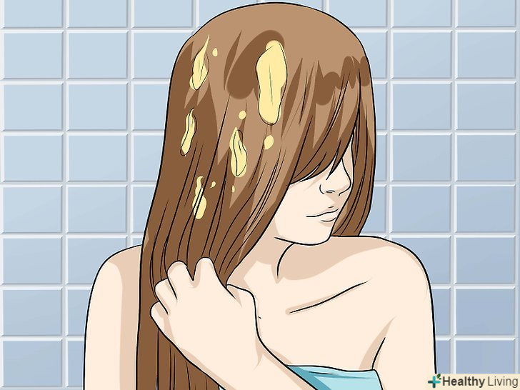 Втирайте масло в волосся масажними рухами. занурте Пальці в масляну суміш і розподіліть її по волоссю. Втирайте глибоко, щоб покрити кожне пасмо до самої шкіри голови. Якщо вам не вдалося рівномірно нанести масло, скористайтеся гребінцем, щоб розподілити масло після того, як ви нанесли його на волосся. Можна втерти масло в шкіру голови, щоб стимулювати ріст волосся. [7]