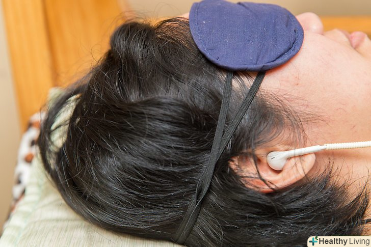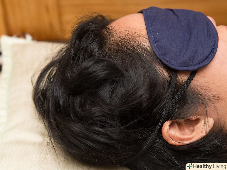 Зробіть так, щоб в кімнаті було темно. закрийте штори або жалюзі. Якщо у вас є маска для сну, то ви можете надіти її, або ж просто закрийтеся від світла подушкою. У вітальнях часто не буває темних штор, тому ви можете накритися ковдрою, щоб було досить темно для сну.