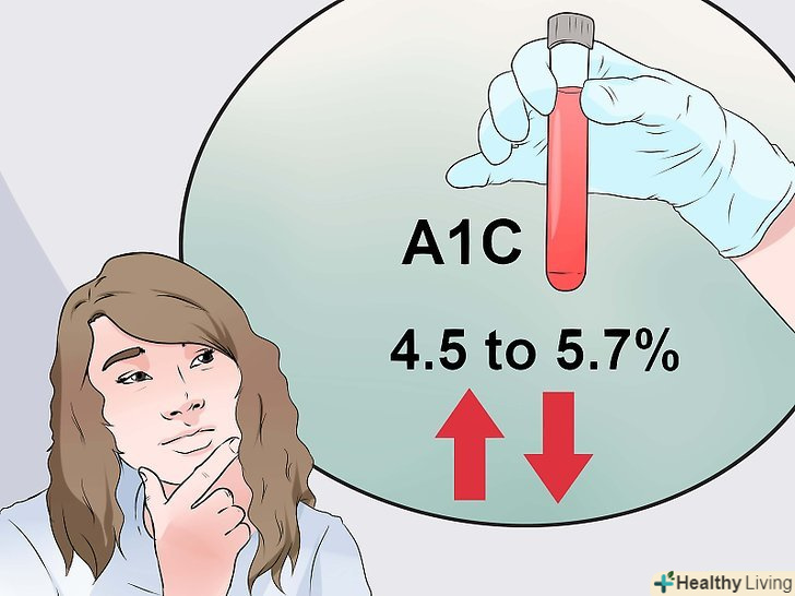 Навчіться розбиратися в результатах.аналіз на глікірованний гемоглобін вимірює те, яка кількість гемоглобіну в крові покрито молекулами цукру. Якщо ця кількість вище норми, то це вказує на проблеми із засвоєнням цукру, що підвищує ризик розвитку діабету.[5]- Нормою вважаються показники від 4,5 до 5,7%. 5% - це 97 міліграмів на децилітр (5,4 ммоль/літр).[6]