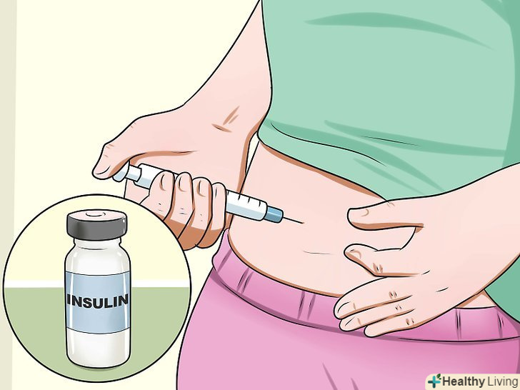 Приймайте інсулін.інсулінотерапія необхідна для людей з діабетом першого типу. Іноді вона може бути потрібна і людям з діабетом другого типу. Ваш лікар обов'язково повідомить, чи потрібне лікування інсуліном у вашому випадку і як часто. Як правило, діабетикам 1 типу необхідно починати з двох ін'єкцій інсуліну в день, а діабетикам 2 типу може бути необхідна одна ін'єкція разом з іншими препаратами (наприклад, таблетками). В обох випадках з часом організм стає все менш сприйнятливим до інсуліну. Інсулін може бути введений різним чином: найпростішим і поширеним способом є уколи. Однак є також є інсулін в ручках і помпах.[3]- Інсулін необхідно вводити в один і той же ділянку тіла, але не в точності в одне і те ж місце.