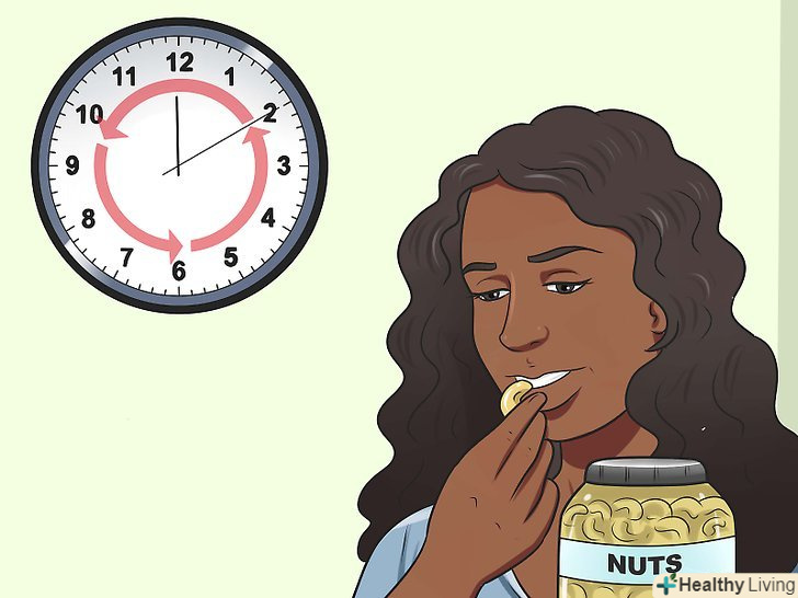 Частіше їжте.для підтримки рівня цукру в крові людям з низьким рівнем цукру корисні часті прийоми їжі, в іншому випадку у них може з'явитися тремтіння, паніка, сплутаність або втрата свідомості. Нерегулярне харчування призводить до того, що рівень цукру може підскакувати занадто високо, а після цього падати до занадто низьких значень. Подібні коливання цукру можуть призводити до діабету. Заплануйте прийоми їжі через кожні три-чотири години: вони повинні бути невеликими, але досить насичувати вас. Ви також можете додати перекушування.[9]- Тримайте завжди з собою перекус на випадок, якщо у вас раптово впаде рівень цукру. Дієтичні крекери або зернові батончики можуть бути відмінним перекусом, і їх зручно носити з собою.