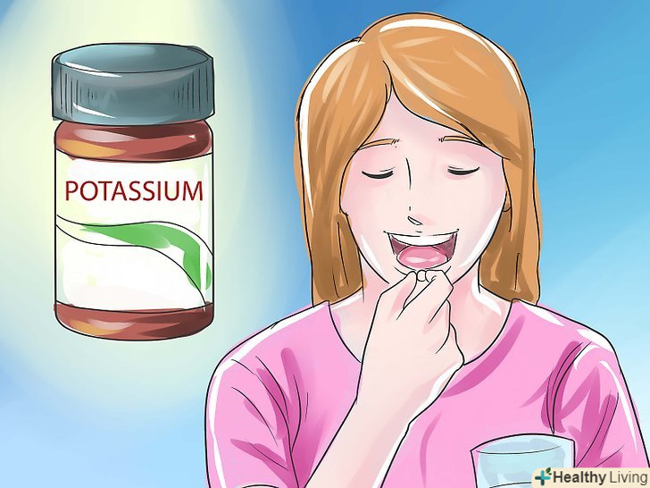 Приймайте препарати калію у вигляді пігулок. пігулки спроектовані таким чином, що вони розчиняються не в шлунку, а в кишечнику. Це допоможе запобігти подразнення шлунка. Препарати калію слід запивати склянкою води.[5]- Не розжовуйте таблетки калію, так як це вплине на їх розчинність.
