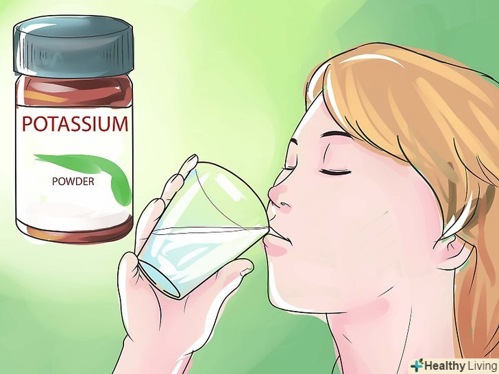 Спробуйте препарати в порошкоподібній або рідкій формі.можна придбати препарати калію в порошкоподібній або рідкій формі, які можна змішувати з водою і випивати. Для правильного дозування ви повинні слідувати вказівкам лікаря. Як правило, порошкоподібний і рідкий калій повинен бути повністю розчинений в ½ склянки води. Якщо вживати занадто багато цього порошку або рідини, це може викликати подразнення шлунка.[6]