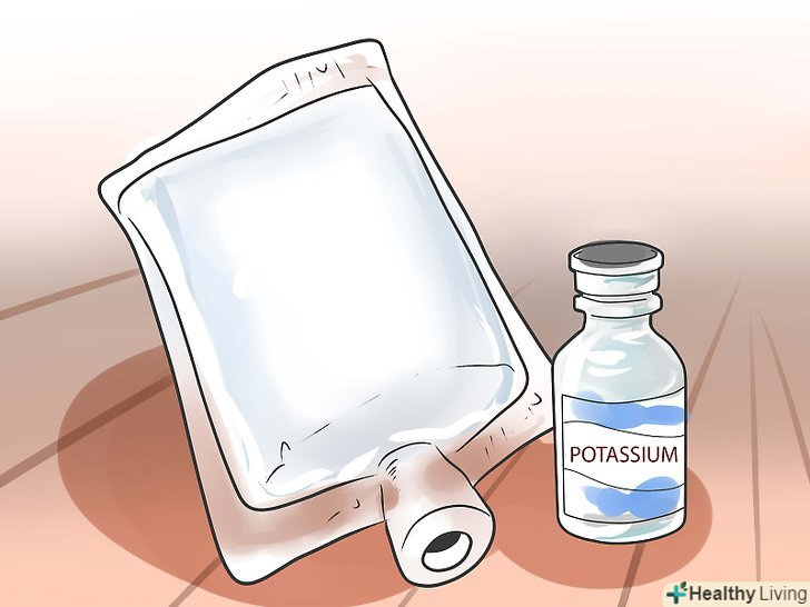 Розгляньте внутрішньовенне введення калію.введення калію внутрішньовенно призначене строго для екстремальних випадків дефіциту калію і використовується під суворим наглядом лікаря. Якщо ви вважаєте, що ваш рівень калію небезпечно низький, поговоріть зі своїм лікарем про внутрішньовенне введення калію. Не намагайтеся робити це самостійно. Швидке вливання може привести до небезпечної для життя аритмії.[7]