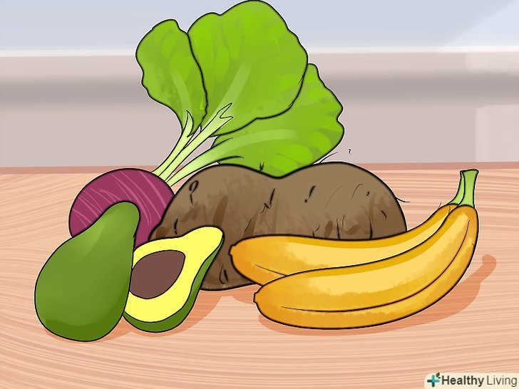 Відвідайте лікаря.якщо ви підозрюєте, що у вас дефіцит калію, необхідно звернутися до лікаря, перш ніж приймати біологічно активні добавки або намагатися підняти рівень калію іншими способами. При відхиленні від стандартної дієти ви легко можете перестаратися, і в результаті у вашому раціоні буде занадто багато калію. Фахівці вважають, що при збалансованому харчуванні добова доза калію повинна становити 4700 міліграмів.[10] лікар призначить відповідний аналіз крові, щоб визначити вміст калію у вашому організмі, і на підставі отриманих результатів порекомендує відповідне лікування.- У більшості випадків лікування полягає в тому, щоб їсти більше продуктів, багатих калієм.