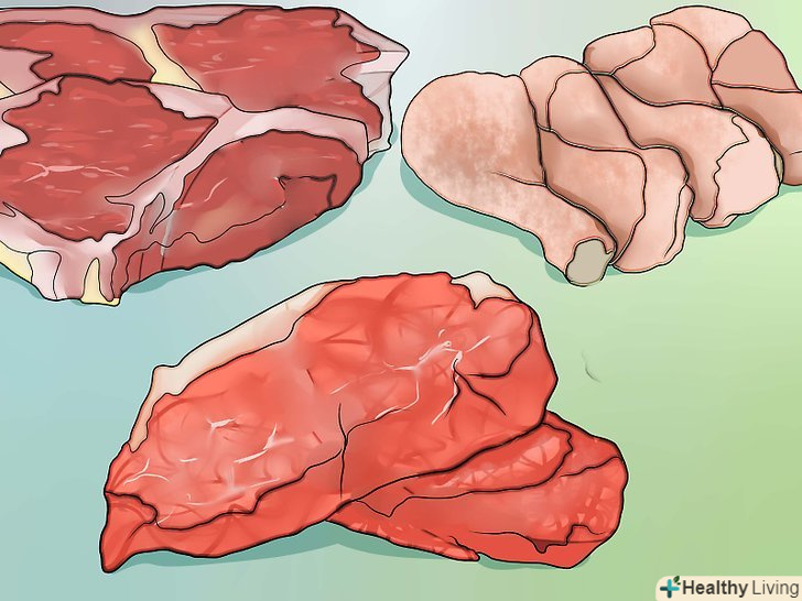 Доповніть свій раціон багатим калієм м'ясом.калій міститься в різних видах м'яса, хоча там його не так багато, як в деяких інших продуктах. Порція м'яса вагою 100 грамів містить наступну кількість калію:[17][18]- 451 міліграм — курятина;