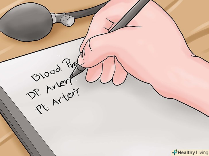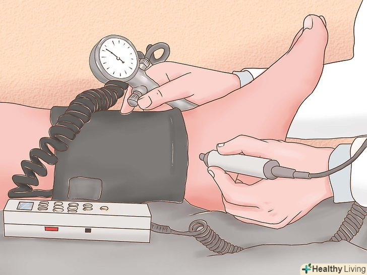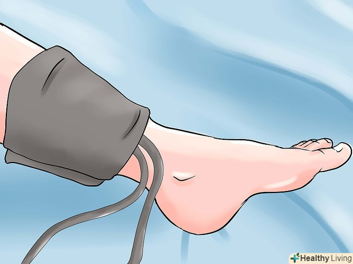 Зареєструйте кров'яний тиск в тильній артерії стопи.Накачайте манжету для вимірювання кров'яного тиску до 20 мм рт.ст. вище звичайного систолічного тиску пацієнта або поки свистячий звук з доплерівського датчика не зникне. Опустіть повітря з манжети і зверніть увагу, коли свистячий звук повертається. Це систолічний артеріальний тиск на щиколотці.