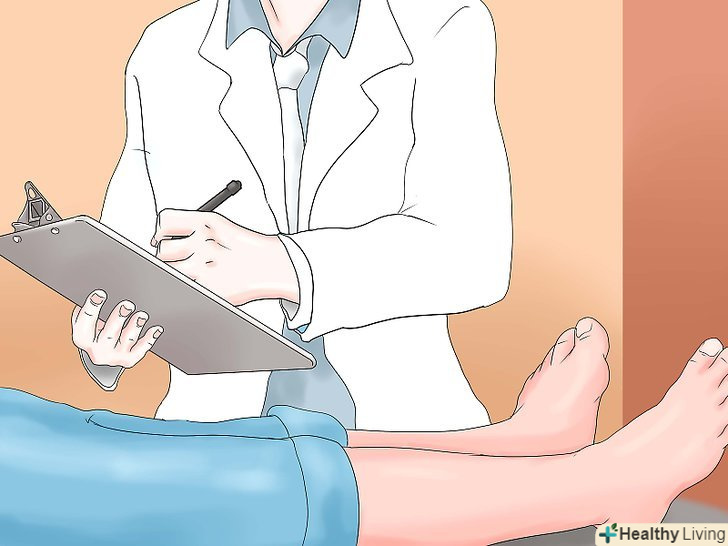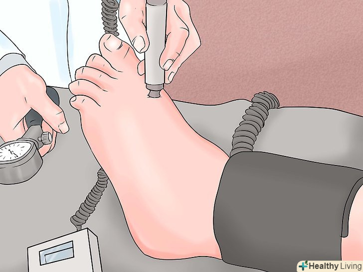 Знайдіть тильну артерію стопи.тильна артерія стопи (а.dorsalis pedis) знаходиться на верхній поверхні стопи в безпосередній близькості до того місця, де стопа переходить кісточку. Нанесіть гель для ультразвуку на цю верхню частину стопи. Розташуйте доплерівський ультразвуковий датчик на найсильнішу точку тильної артерії стопи. Перемістіть датчик навколо, поки не знайдете місце, де пульс найгучніший. Ви повинні почути пульсацію або свистячий звук. [7]