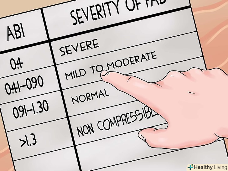Запишіть і інтерпретуйте результат. нормальний щиколотково-плечовий індекс в стані спокою становить від 1,0 до 1,4. Чим ближче ЛПІ пацієнта до 1, Тим краще результат. Це означає, що кров'яний тиск на руці повинен бути якомога ближче до кров'яного тиску на щиколотці. [12]- ЛПІ менше 0,4 передбачає серйозні захворювання периферичних артерій. У пацієнта можуть розвинутися незагойні виразки або гангрена.