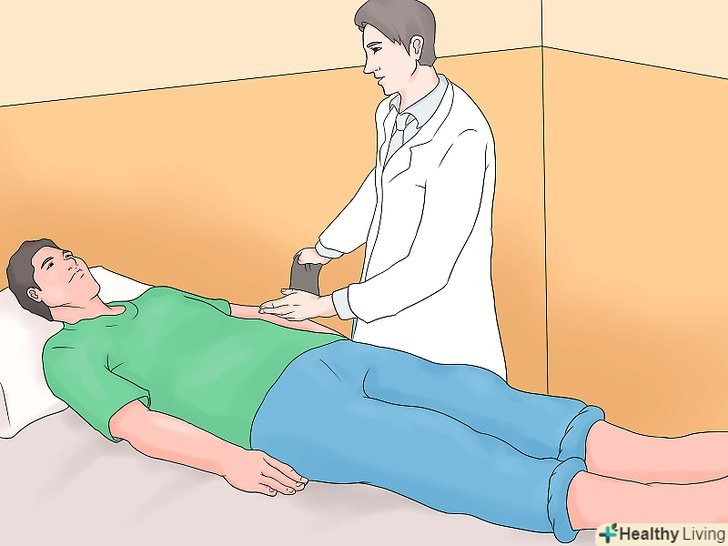 Попросіть пацієнта лягти в положення горілиць.положення горілиць відоме як положення лежачи на спині. Переконайтеся, що ваш пацієнт лежить на плоскій поверхні так, що його руки і ноги знаходяться на рівні серця. Дозвольте пацієнту відпочити, щонайменше, 10 хвилин, перш ніж вимірювати його кров'яний тиск. Відпочинок допоможе нормалізувати його кров'яний тиск, особливо, якщо він турбується, а також дозволяє вирівняти роботу серця і плечовий пульс. [1]- Обидві руки вашого пацієнта повинні бути доступні. Рукава повинні бути вільними і закатати в сторону.
