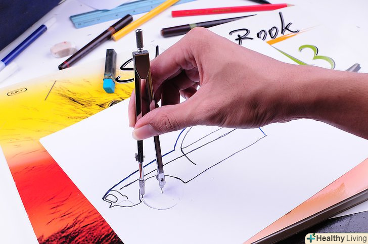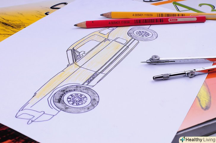 Намалюйте автомобіль на папері.використовуйте предмети побуту, щоб зобразити колеса, наприклад, склянку або кришку. Якщо ви не можете знайти предмет відповідного розміру, купіть готовальню. Ви навіть можете замовити його через Інтернет, наприклад, через Amazon або E-Bay.