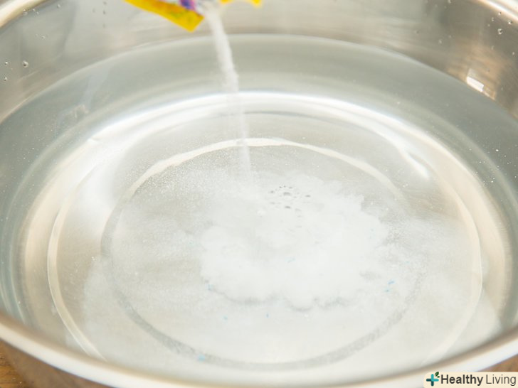 Додайте в миску: 2 склянки теплої води, ½ чайної ложки прального порошку і 1 столову ложку білого оцту. Кожен з цих інгредієнтів буде по-своєму впливати на очищення фіксатора зап'ястя.- Миючий засіб усуває масла, які виробляються шкірними сальними залозами.
