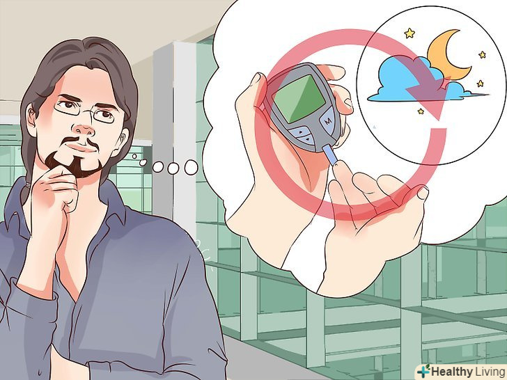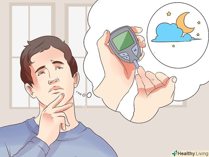 Продовжуйте перевіряти рівень глюкози ночами.навіть після з'ясування відповідних параметрів слід вимірювати рівень глюкози вечорами. Згодом реакція вашого організму на терапію може змінитися, і вам буде потрібно внести корективи в дозування або план лікування.[9]- Перевіряйте рівень глюкози перед тим, як відправитися спати, щоб запобігти занадто високий або низький рівень під час сну.