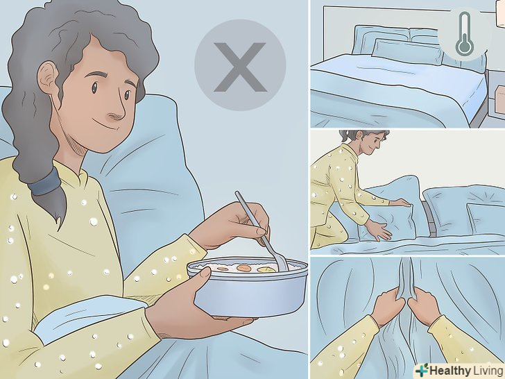 У спальні має бути прохолодно, чисто, темно і тихо.постарайтеся, щоб температура у вашій спальні не перевищувала 21 °C. Регулярно робіть прибирання і міняйте постільну білизну раз в 1-2 тижні або як тільки воно забрудниться. Захаращена кімната підвищує стрес, а на не дуже чистих простирадлах буває складно розслабитися.[18]- Використовуйте спальню виключно для сну. Не працюйте, не приймайте їжу, не говоріть по телефону і не займайтеся іншими сторонніми справами в своєму ліжку. Ліжко і спальня повинні асоціюватися лише з розслабленим станом і сном.