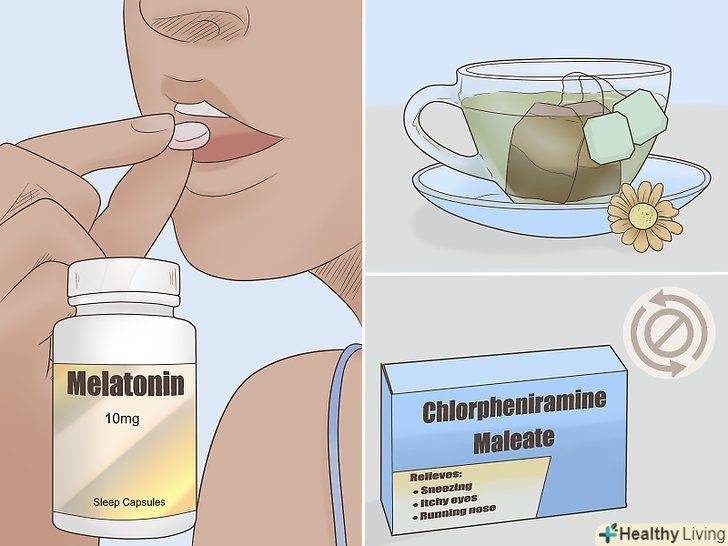 Спробуйте приймати снодійні засоби.у продажу є безліч сприяють сну засобів. Перш ніж використовувати ту чи іншу харчову добавку або препарат, рекомендується порадитися з лікарем, особливо в тому випадку, якщо у вас які-небудь проблеми зі здоров'ям, ви приймаєте інші ліки, вагітні або годуєте грудьми. Можна спробувати приймати такі засоби:[6]- Мелатонін — гормон, який природним чином виробляється в організмі, міститься в різних продуктах і не викликає залежності при вживанні. Це одне з найпоширеніших снодійних засобів. Хоча стандартна доза становить 3 міліграма, навіть 0,3 міліграма здатні помітно поліпшити якість сну.[7]