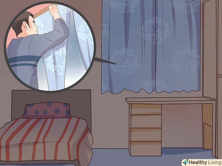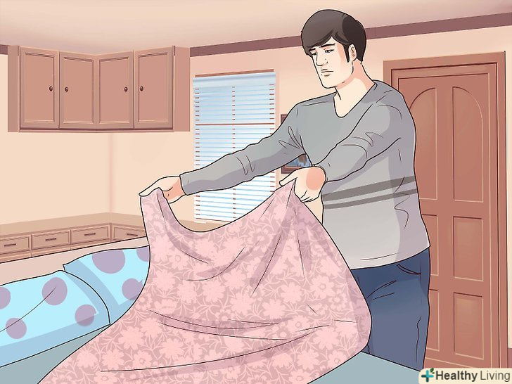 Подбайте про те, щоб у вашій спальні було прохолодно.під теплими затишними ковдрами зазвичай хочеться спати, однак якщо вам занадто жарко, це зазвичай заважає сну. По можливості регулюйте температуру в приміщенні, де ви спите; якщо вам жарко, приберіть ковдру. Спіть голяка, якщо вам це зручно, щоб ваш організм міг самостійно регулювати температуру.[11]- Зменшіть рівень тепла в нічний час. Вночі температура тіла знижується, тому вам буде більш комфортно, якщо в кімнаті буде прохолодно.[12]