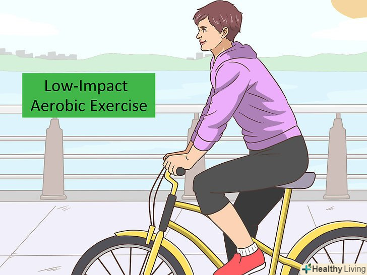 Займіться щадними аеробними вправами.Ходьба, Повільна їзда на велосипеді, танці та інші форми легких аеробних навантажень найкраще підходять для людей з проблемними суглобами. Збільшуйте навантаження поступово і постарайтеся довести обсяг легких аеробних тренувань до двох з половиною годин на тиждень.[26]- Ви також можете спробувати зайнятися легким або швидким бігом і їздою на велосипеді з більш високою швидкістю, якщо тільки будете впевнені, що не отримаєте травму.