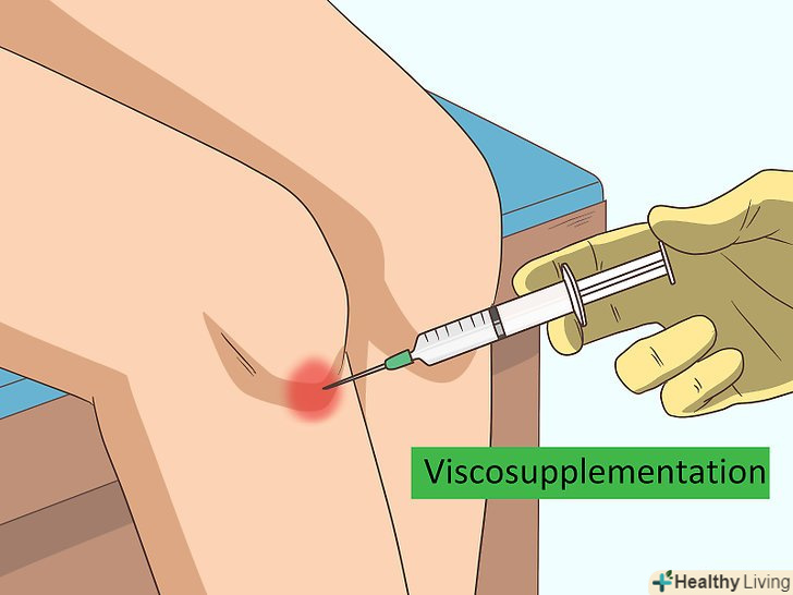 Запитайте лікаря про віскосапплементарной терапії.якщо у вас зменшилася кількість синовіальної рідини або знизилася її якість, лікар може зробити ін'єкції гіалуронової кислоти в постраждалий суглоб. Залежно від вираженості болю в суглобі, протягом декількох тижнів виконується від 1 до 5 ін'єкцій. Це швидка процедура, але протягом 48 годин після ін'єкції вам доведеться уникати надмірної активності.[34]- Після ін'єкцій ви можете відчувати біль, печіння або невеликий набряк. Ці симптоми знімаються холодним компресом і швидко проходять. Зв'яжіться з лікарем, якщо симптоми посилюються або відкрилося кровотеча.
