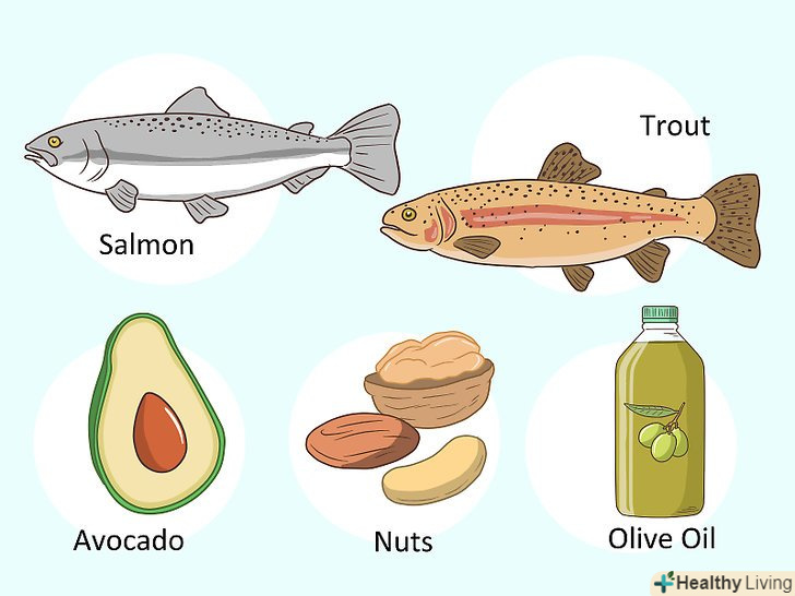 Їжте більше риби і корисних жирів.сьомга, форель та інші види жирної риби дуже корисні для здоров'я суглобів, тому намагайтеся з'їдати щонайменше 2-3 порції риби в тиждень. Авокадо, горіхи, оливкова олія та інші джерела корисних жирів можуть допомогти збільшити кількість суглобової рідини. Незважаючи на користь деяких жирів, загальна кількість споживаних жирів і масла потрібно обмежувати.[2]- Рекомендована щоденна норма варіюється від 5 до 7 чайних ложок і залежить від вашого віку, статі та рівня активності. У авокадо середнього розміру міститься 6 чайних ложок жирів, 2 столові ложки (30 мл) арахісової пасти містять 4 чайні ложки, а порція сирих або смажених горіхів містить 3-4 чайні ложки жирів.[3]