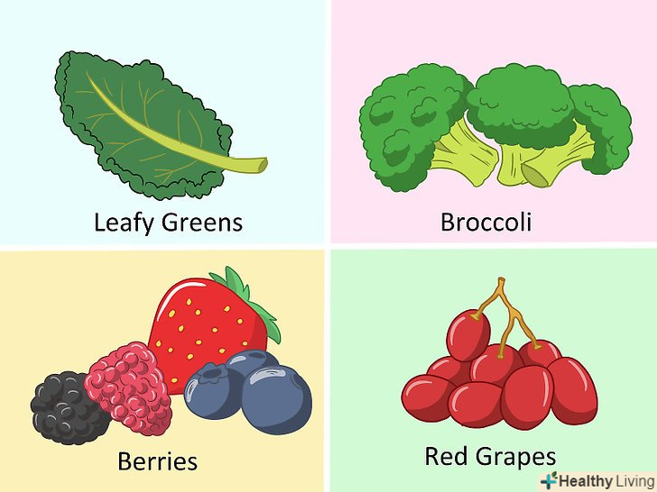 Їжте більше фруктів і овочів.фрукти і овочі забезпечують нас вітамінами, мінералами і рідиною, а багато з них мають ще й протизапальними властивостями. Листова зелень, брокколі, ягоди і червоний виноград насичені антиоксидантами. Джерела вітаміну С, включаючи цитрусові та перець, допомагають запобігти руйнуванню хрящової тканини.[5]- Кількість фруктів, які вам необхідно з'їдати, залежить від вашого віку, статі та інших факторів. Орієнтуйтеся приблизно на 1,5-2 чашки (350-500 мл) фруктів в день. У невеликому яблуці, великому апельсині або великому банані міститься порція в 1 чашку (240 мл).[6]