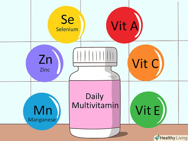 Подумайте про щоденний прийом вітамінів.прийом мультивітамінів дасть вам впевненість, що ваш організм отримує необхідні поживні речовини для виробництва якісної синовіальної рідини. Особливо корисні для здоров'я суглобів селен, цинк, марганець і вітаміни А, С і Е.[13]- Запитайте лікаря, чи потрібно вам приймати мультивітаміни, і уточніть дозування. Якщо лікар схвалить їх прийом, знайдіть харчову добавку, в складі якої буде достатня кількість зазначених вище вітамінів для здоров'я суглобів.[14]