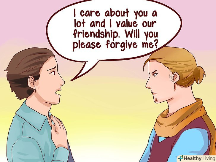 Попросіть вибачення.після того як ви вибачилися, можете попросити людину пробачити вас. Це може бути найскладнішою частиною вибачення, так як завжди є ймовірність того, що людина вас не пробачить. Насправді, вам потрібно продемонструвати своє розуміння, даючи людині і такий варіант результату вашого діалогу. Просто майте на увазі, що ви завжди можете спробувати ще раз, якщо людина не готова пробачити вас. Намагайтеся не засмучуватися і не втрачати надії.[9]- Наприклад: "Ти мені абсолютно не байдужа, і я дуже ціную нашу дружбу. Прости меня, пожалуйста?”.