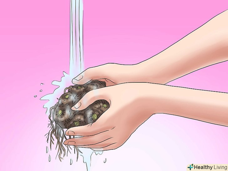 Видаліть грунт з цибулини. акуратно збийте якомога більше грунту від здорових цибулин без пошкодження коренів. Промийте цибулини в прохолодній проточній воді (наприклад, водою з садового шланга), щоб видалити решту грунту.
